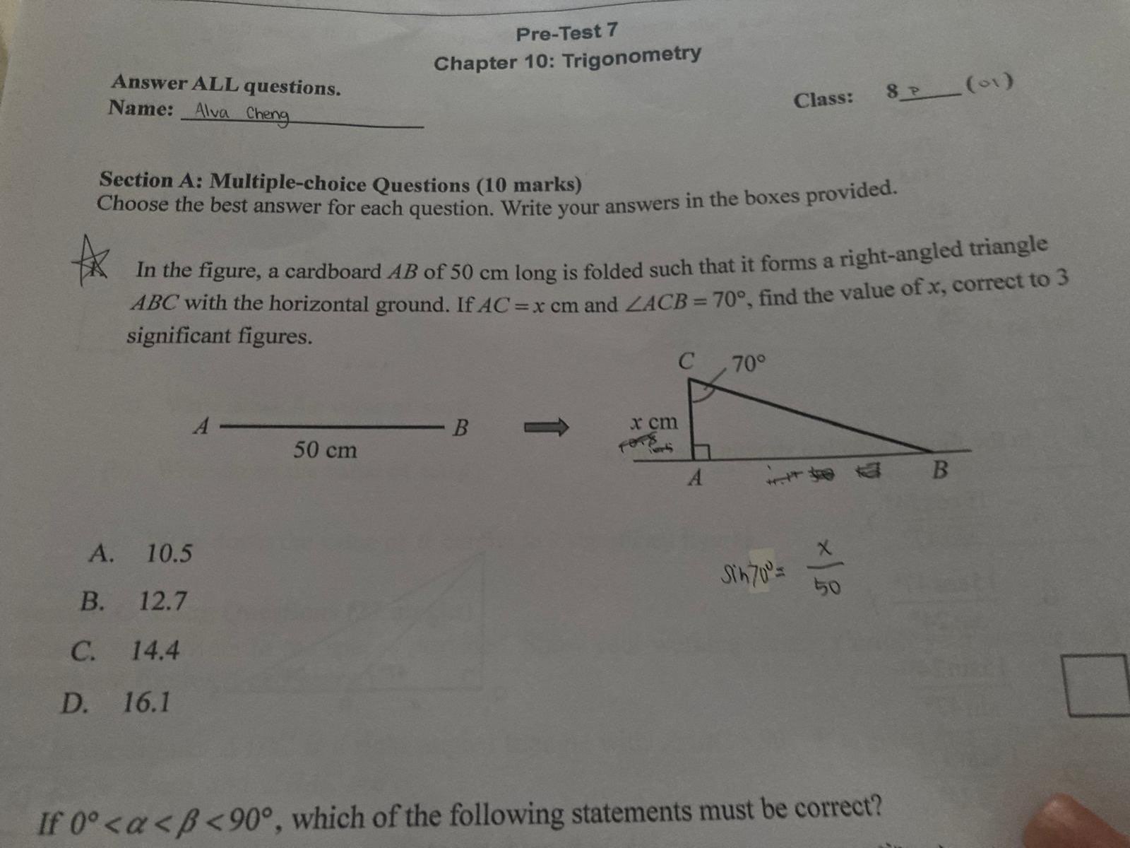 Question 2 $ \cos \theta = \frac {Adjacent}{Hypotenuse} $ $ \cos 70^\circ = \frac{x}{50 - x} $ $ \cos 70^\circ (50 - x) = x $ $ x = \frac{50 (\cos 70^\circ )}{1 + \cos 70^\circ} $ Hence, $ x = 12.5 $