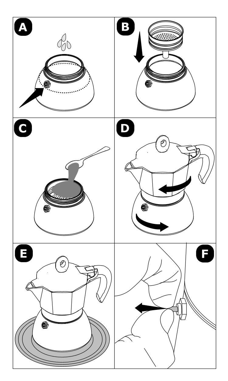 - When the upper unit (3) is full of coffee, remove the coffee maker from the heat source and pour. BIALETTI INSPECTION SAFETY VALVE (8) The Bialetti valve has been patented and designed to guarantee the use of the coffee maker in complete safety. Using the coffee maker with drinking water might entail the risk of formation of lime scale in the hole of the valve, causing its clogging. To avoid clogging arising from lime scale, just move the small piston coming out of the valve along its axis during the normal washing oper- ations, Fig. (F). It is advisable to carry out this inspection periodically to ensure its proper operation. The safety valve is a protective element and should intervene only in conditions of abnormal operation or use of the coffee maker.