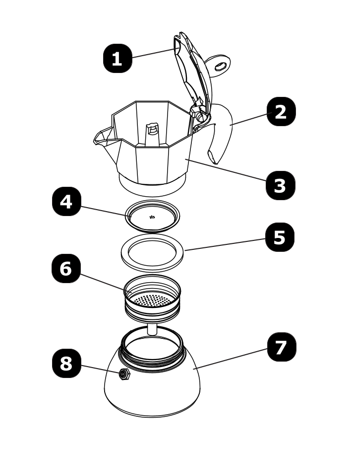 - Periodically check the internal components and, in case of wear- ing or damage, replace them only with original Bialetti spare parts suitable for the model used. Replace the gasket (5), if worn. It is recommended to replace it at least once a year anyway.