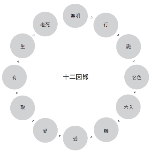 十二緣起支分別是:1.無明、2.行、3.識、4.名色、5.六入、6.觸、7.受、8.愛、9.取、10.有、11.生、12.老死